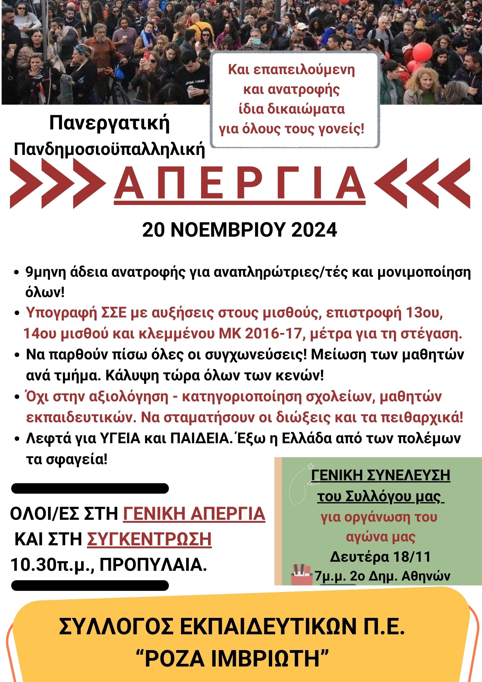 163ο Ενημ. 20 ΝΟΕΜΒΡΗ ΟΛΟΙ ΣΤΗΝ ΠΑΝΕΡΓΑΤΙΚΗ ΑΠΕΡΓΙΑ & ΣΤΗΝ ΑΠΕΡΓΙΑΚΗ ΣΥΓΚΕΝΤΡΩΣΗ 10.30πμ στα ΠΡΟΠΥΛΑΙΑ με το μπλοκ του Συλλόγου μας "ΡΟΖΑ ΙΜΒΡΙΩΤΗ". ΣΣΕ με αυξήσεις, επιστροφή δώρων, 9μηνη άδεια ανατροφής, κενά, χρηματοδότηση, αξιολόγηση, διώξεις 11/11/24