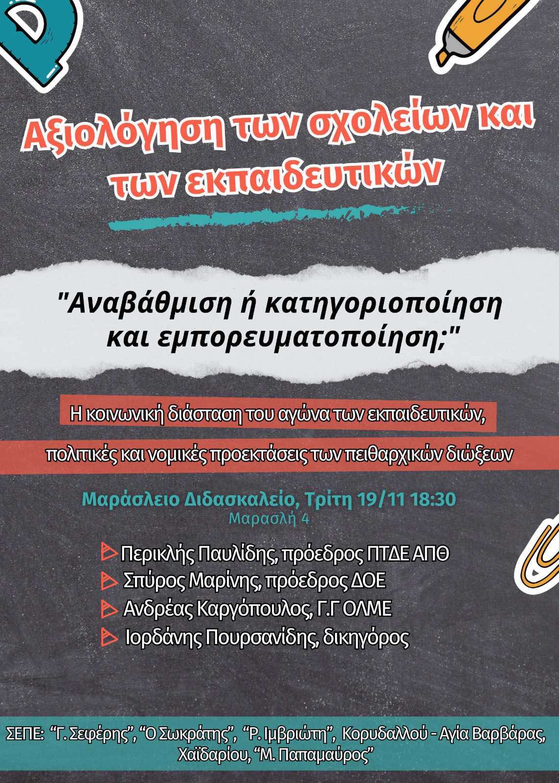 Αφίσα - Κάλεσμα στην ΕΚΔΗΛΩΣΗ - ΣΥΖΗΤΗΣΗ Αξιολόγηση Σχολείων Εκπαιδευτικών: Αναβάθμιση ή Κατηγοριοποίηση κι Εμπορευματοποίηση.... Μαράσλειο Τρίτη 19/11 στις 18.30.