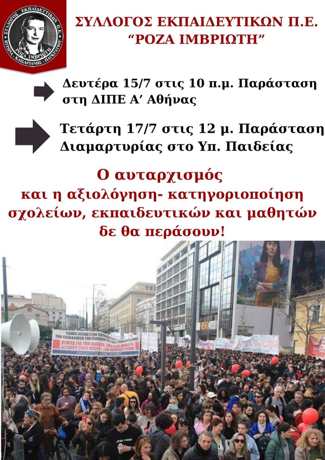 Αφισάκι Συλλόγου μας ΡΟΖΑ ΙΜΒΡΙΩΤΗ κάλεσμα στις Παραστάσεις 15/7 10πμ ΔΙΠΕ Α΄ Αθήνας και 17/7 12μ ΥΠΑΙΔ. Συμμετέχουμε μαζικά, αγωνιζόμαστε συλλογικά!