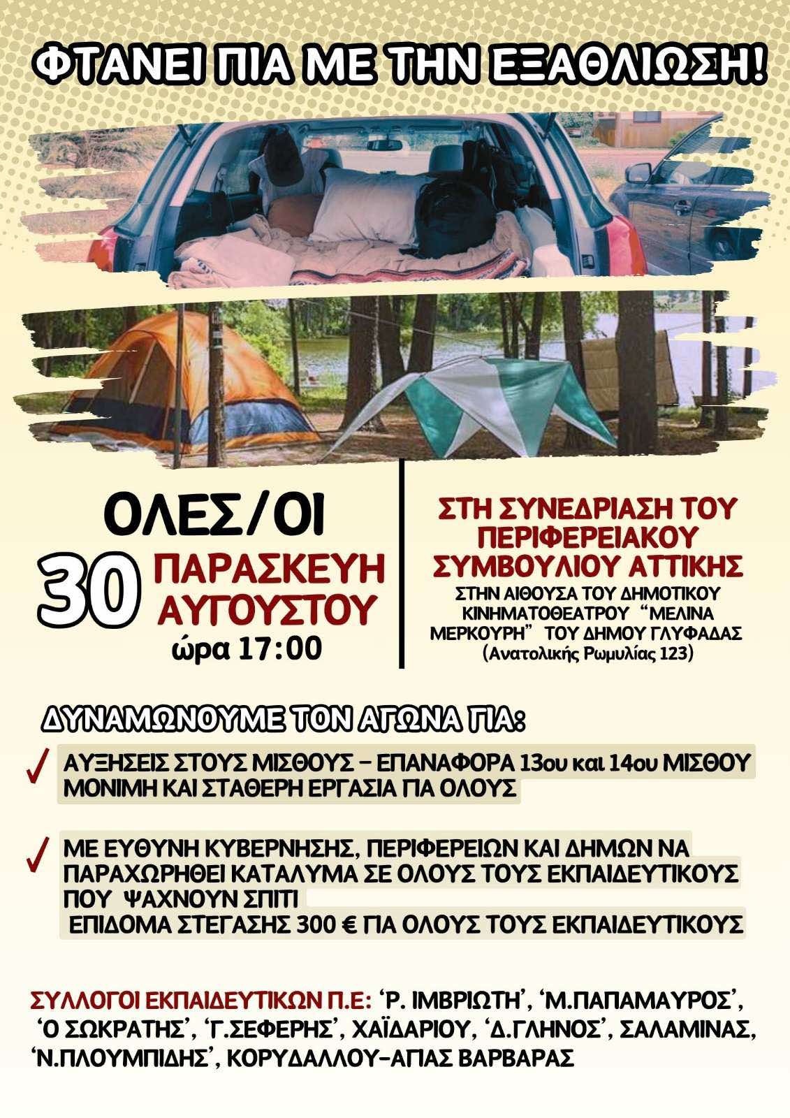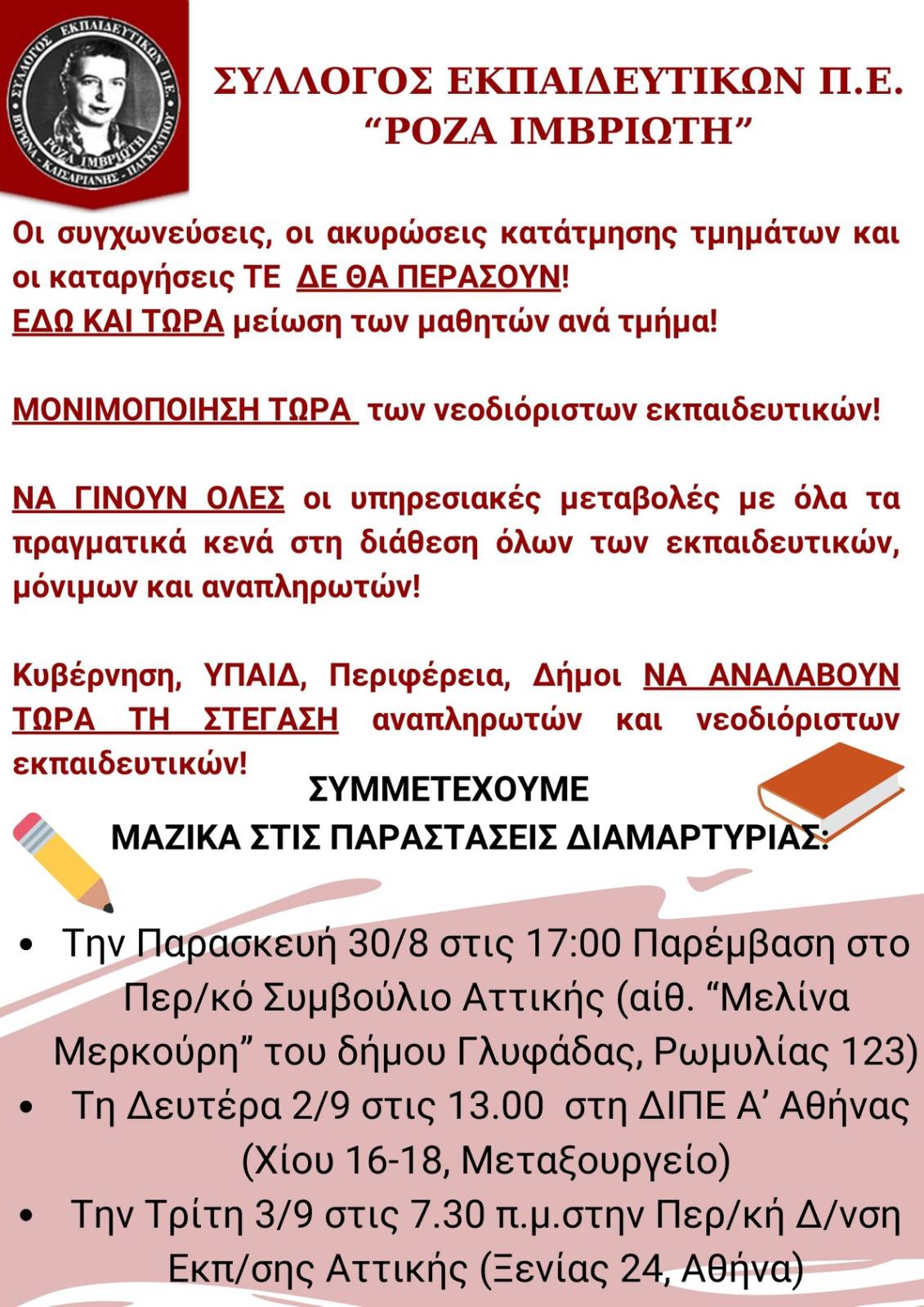 Αφίσα ΣΥΛΛΟΓΩΝ Π.Ε. και του Συλλόγου μας "ΡΟΖΑ ΙΜΒΡΙΩΤΗ" - Κάλεσμα στην Παρέμβαση στο Περ/κό Συμβούλιο για τη στέγαση των νεοδιορίστων και αναπληρωτών εκπ/κών την Παρασκευή 30/8/2024 στις 17:00 στη Γλυφάδα. Συμμετέχουμε μαζικά!