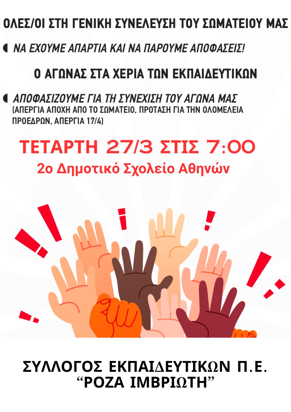 Αφίσα Κάλεσμα στην Έκτακτη ΓΕΝΙΚΗ ΣΥΝΕΛΕΥΣΗ του Συλλόγου μας "ΡΟΖΑ ΙΜΒΡΙΩΤΗ" την Τετάρτη 27/3 στις 7μμ για πλαίσιο πάλης και κήρυξη απεργίας αποχής από την αξιολόγηση-κατηγοριοποίηση από το σωματείο μας. Συσπειρωμένοι στον Σύλλογό μας συνεχίζουμε!