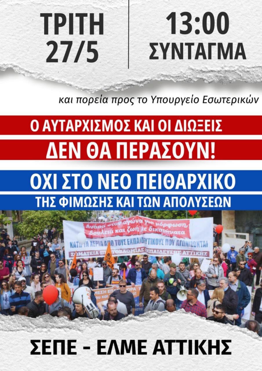 Αφίσα Κάλεσμα στην Κινητοποίηση των Εκπαιδευτικών στο Σύνταγμα και στην Πορεία στο ΥΠΕΣ Τρίτη 27/5/2025 στις 13.00.