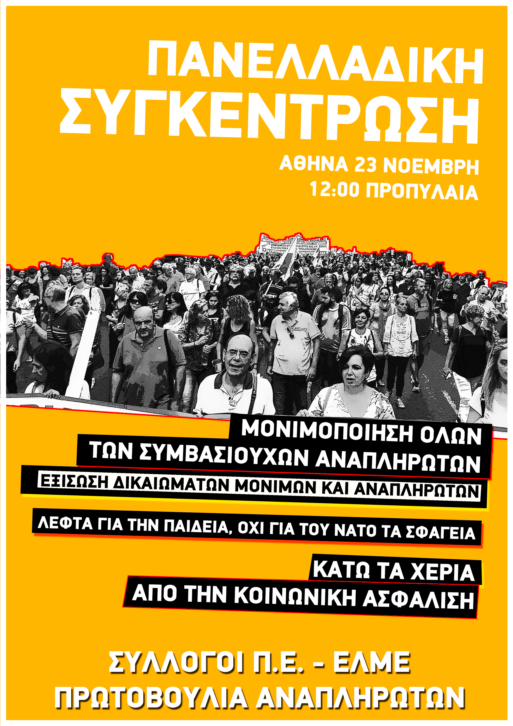 Αφίσα Κάλεσμα ΣΥΛΛΟΓΩΝ-ΕΛΜΕ-Πρωτοβουλίας Αναπληρωτών στην Πανελλαδική Κινητοποίηση Σάββατο 23/11/2019 στις 12 μ. Προπύλαια για μονιμοποίηση των πάνω από 35.000 αναπληρωτών, εξίσωση δικαιωμάτων, χρηματοδότηση, καθολική κοινωνική ασφάλιση!