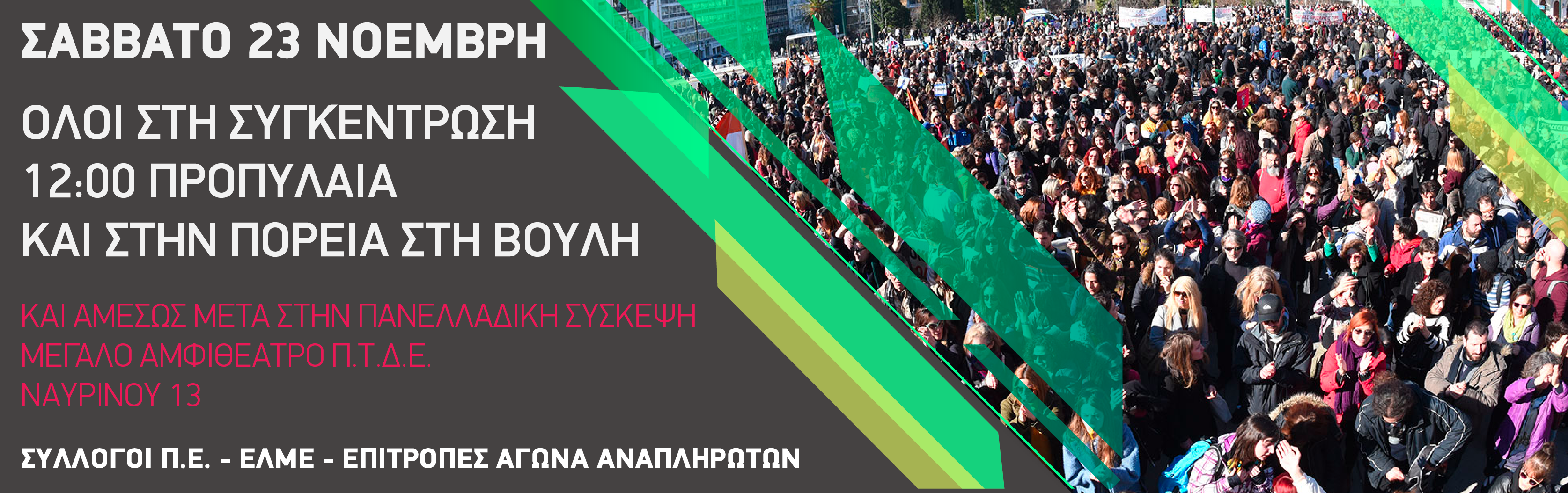 ΟΛΟΙ ΣΑΒΒΑΤΟ 23 ΝΟΕΜΒΡΗ 2019 ΣΤΗ ΣΥΓΚΕΝΤΡΩΣΗ 12 μ. ΣΤΑ ΠΡΟΠΥΛΑΙΑ ΚΑΙ ΣΤΗΝ ΠΟΡΕΙΑ ΣΤΗ ΒΟΥΛΗ! ΚΙ ΑΜΕΣΩΣ ΜΕΤΑ ΣΤΗΝ ΠΑΝΕΛΛΑΔΙΚΗ ΣΥΣΚΕΨΗ ΣΤΟ ΑΜΦΙΘΕΑΤΡΟ ΤΟΥ Π.Τ.ΔΕ. ΝΑΥΑΡΙΝΟΥ 13! Καλούν ΣΥΛΛΟΓΟΙ (και ο Σύλλογός μας "ΡΟΖΑ ΙΜΒΡΙΩΤΗ")-ΕΛΜΕ-ΠΡΩΤΟΒΟΥΛΙΑ ΑΝΑΠΛΗΡΩΤΩΝ!