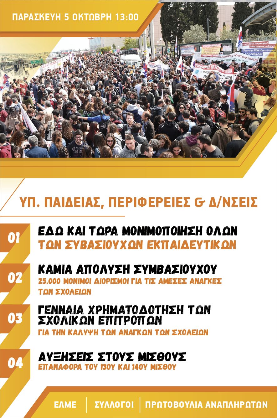 Αφίσα Κάλεσμα ΣΥΛΛΟΓΩΝ, ΕΛΜΕ, ΠΡΩΤΟΒΟΥΛΙΑΣ ΑΝΑΠΛΗΡΩΤΩΝ για Συγκέντρωση 5 Οκτωβρίου 2018 στο Υπ. Παιδείας 13.00! Διεκδικούμε μονιμοποίηση των 25.000 συμβασιούχων εκπαιδευτικών, Χρηματοδότηση, Σύγχρονες Υποδομές, Αυξήσεις στους μισθούς μας!