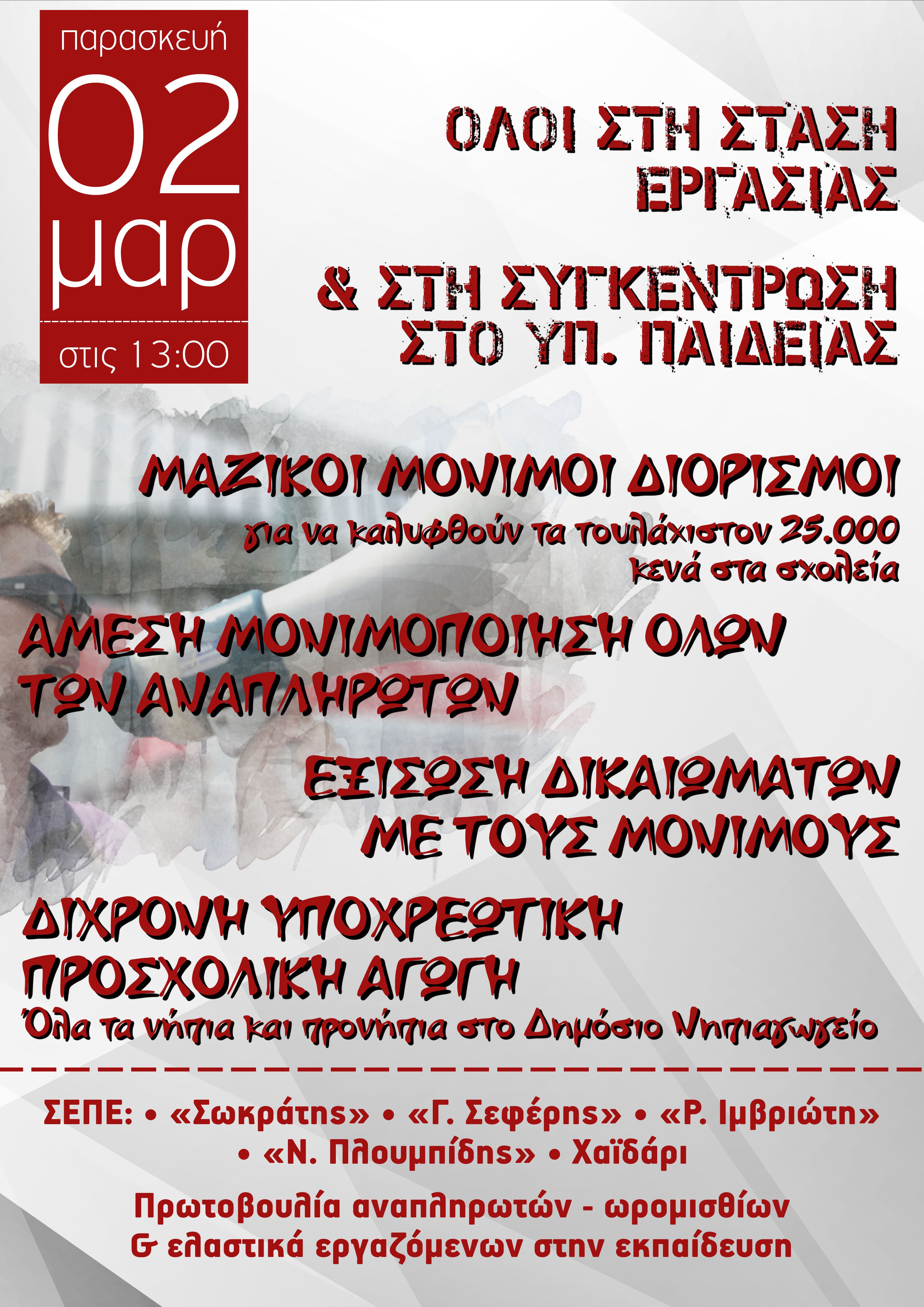 33ο ΕΠΙΚΑΙΡΟΠΟΙΗΜΕΝΟ Ενημ. Κάλεσμα στην Κινητοποίηση 2 Μάρτη 2018 Υπ. Παιδείας 13.00 με 3ωρη ΣΥΝ 3ΩΡΗ Στάση Εργασίας. Αγώνας για μόνιμους διορισμούς, εξίσωση δικαιωμάτων αναπληρωτών με μονίμων, Δίχρονη Υποχρεωτική Προσχολική Αγωγή ΤΩΡΑ! 28.2.2018