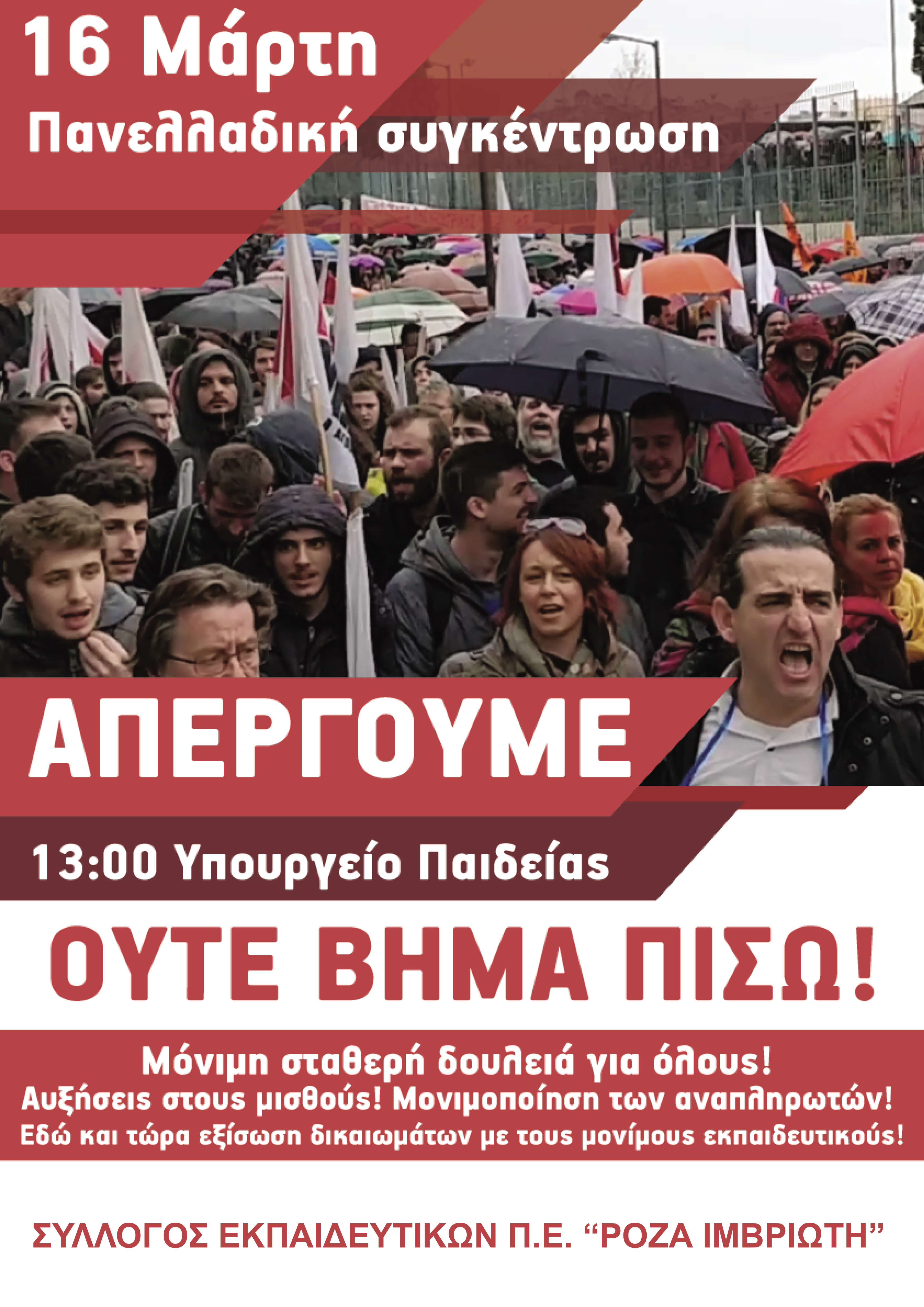 Αφίσα Συλλόγου μας "ΡΟΖΑ ΙΜΒΡΙΩΤΗ": 16 Μάρτη 2018 ΑΠΕΡΓΟΥΜΕ και Συμμετέχουμε στο Πανελλαδικό Συλλαλητήριο Υπ. Παιδείας 13:00. ΟΥΤΕ ΒΗΜΑ ΠΙΣΩ από τους άμεσους μαζικούς διορισμούς τώρα, μονιμοποίηση των αναπληρωτών, εξίσωση δικαιωμάτων τους με μονίμων!