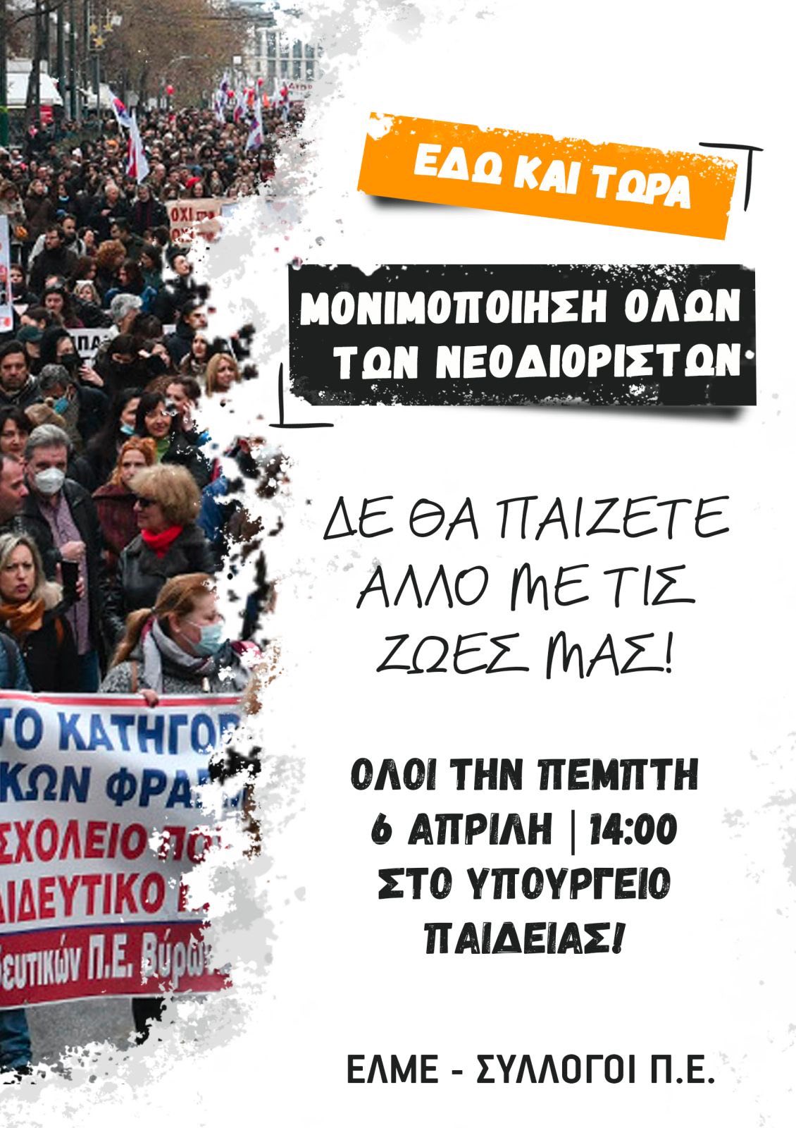 Αφίσα κάλεσμα στην Κινητοποίηση ΣΕΠΕ ΕΛΜΕ στο ΥΠΑΙΔ Πέμπτη 6.4.2023 στις 2μμ για μονιμοποίηση των νεοδιόριστων 2020 και 2021