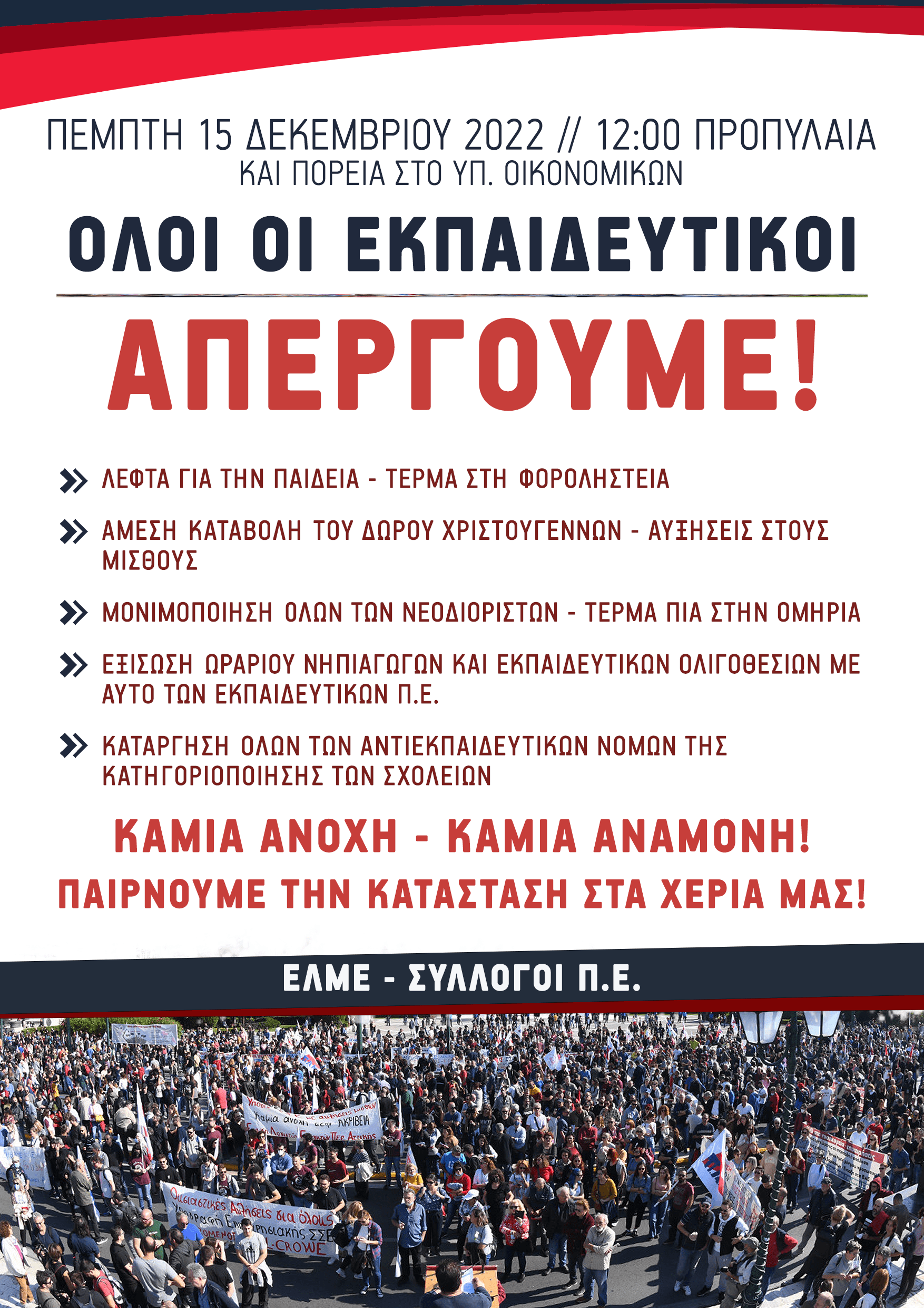 175ο Ενημ. 15/12 ΠΑΝΕΚΠΑΙΔΕΥΤΙΚΗ ΑΠΕΡΓΙΑ και ΣΥΛΛΑΛΗΤΗΡΙΟ 12μ ΠΡΟΠΥΛΑΙΑ για ΣΣΕ με αυξήσεις στους μισθούς μας, δώρο Χριστουγέννων τώρα, μονιμοποίηση νεοδιόριστων, ωράριο Νηπιαγωγών, μόνιμους διορισμούς - μονιμοποίηση αναπληρωτών, ασφαλή σχολεία 7/12/2022