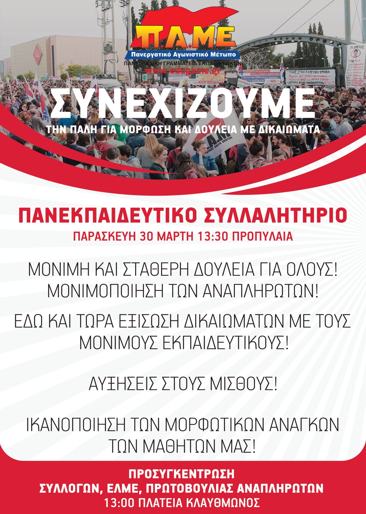 ΣΥΝΕΧΙΖΟΥΜΕ με ΠΑΝΕΛΛΑΔΙΚΟ ΠΑΝΕΚΠΑΙΔΕΥΤΙΚΟ ΣΥΛΛΑΛΗΤΗΡΙΟ στις 30 Μάρτη 2018 στις 13:30 ΠΡΟΠΥΛΑΙΑ (προσυγκέντρωση ΣΥΛΛΟΓΩΝ, ΕΛΜΕ και Πρωτοβουλίας Αναπληρωτών Ωρομισθίων 13:00 πλ Κλαυθμώνος) και ΠΟΡΕΙΑ προς Βουλή και Μέγαρο Μαξίμου! Όλοι στον Αγώνα!