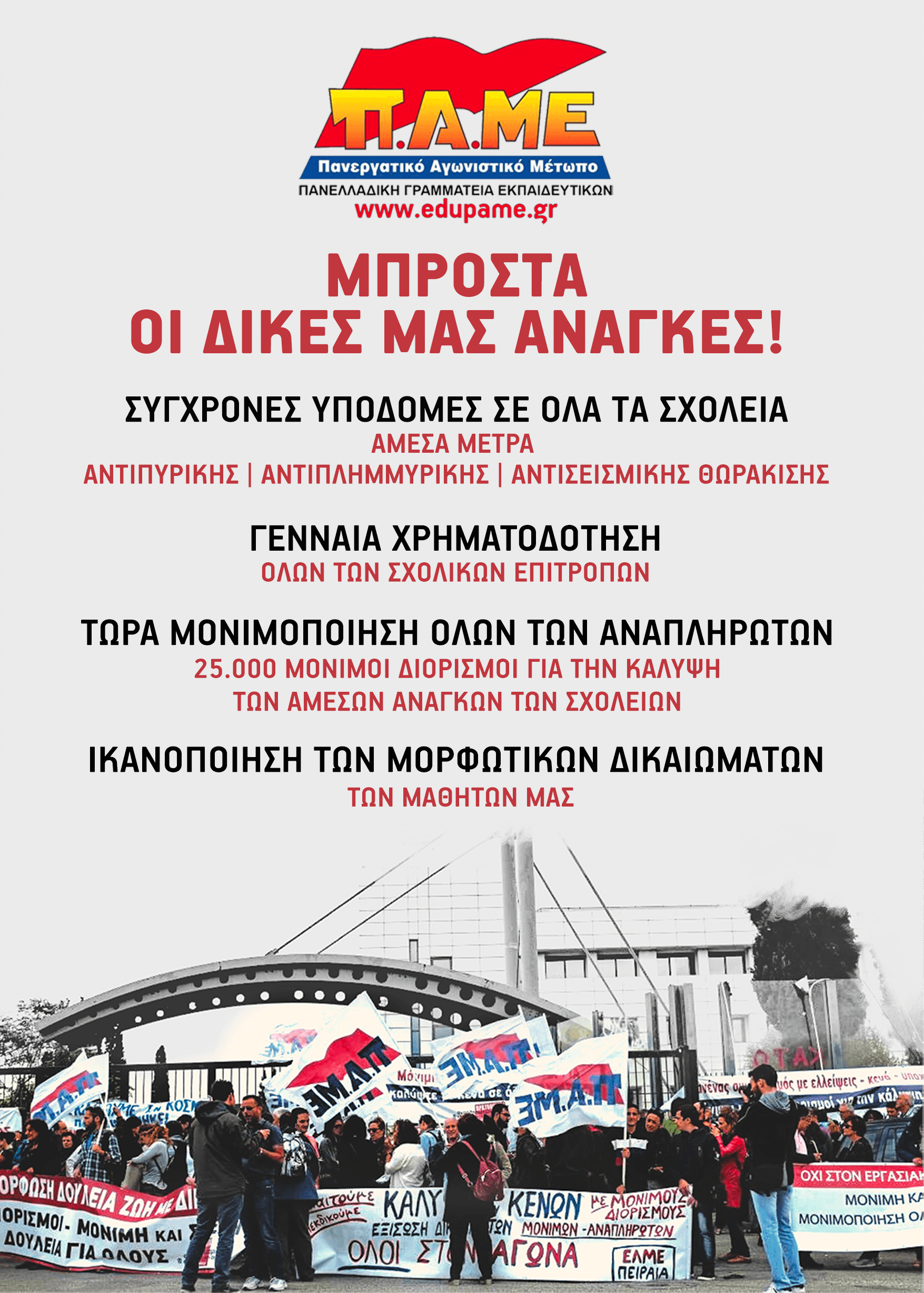 Αφίσα για τη Νέα Σχολική Χρονιά 2018-19: ΣΥΓΧΡΟΝΕΣ ΥΠΟΔΟΜΕΣ ΓΕΝΝΑΙ ΧΡΗΜΑΤΟΔΟΤΗΣΗ, ΜΟΝΙΜΟΠΟΙΗΣΗ ΤΩΝ 25.000 ΑΝΑΠΛΗΡΩΤΩΝ, ΚΑΛΥΨΗ ΤΩΝ ΜΟΡΦΩΤΙΚΩΝ ΑΝΑΓΚΩΝ!