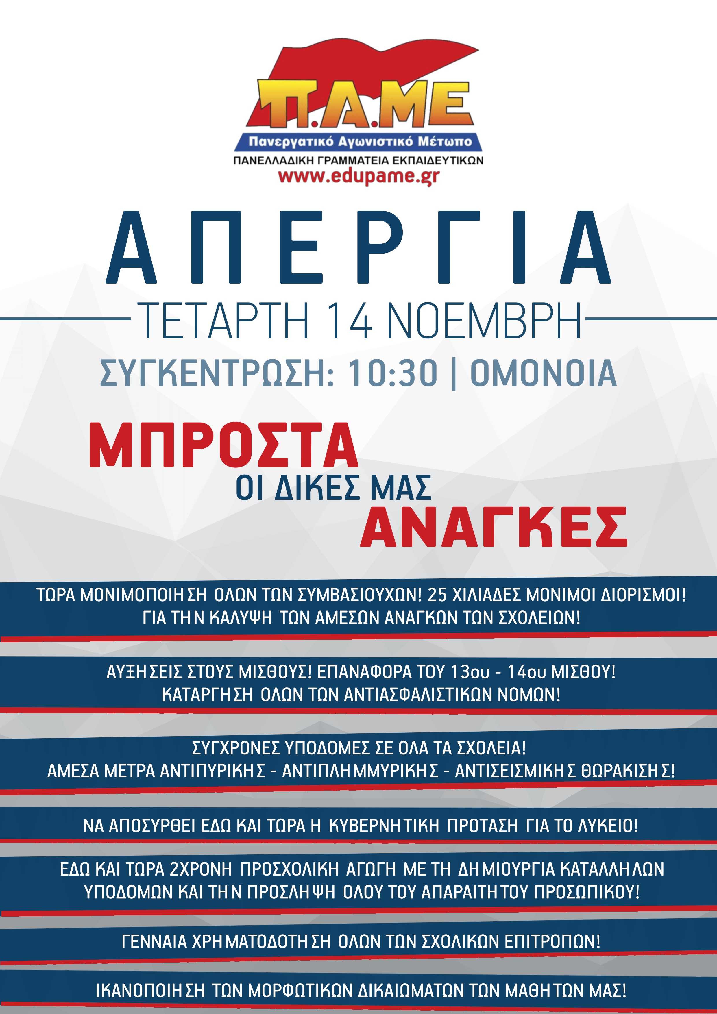 Αφίσα κάλεσμα στην Πανελλαδική Απεργία 14 Νοέμβρη 2018 και στην απεργιακή Συγκέντρωση 10.30 π.μ. Ομόνοια!