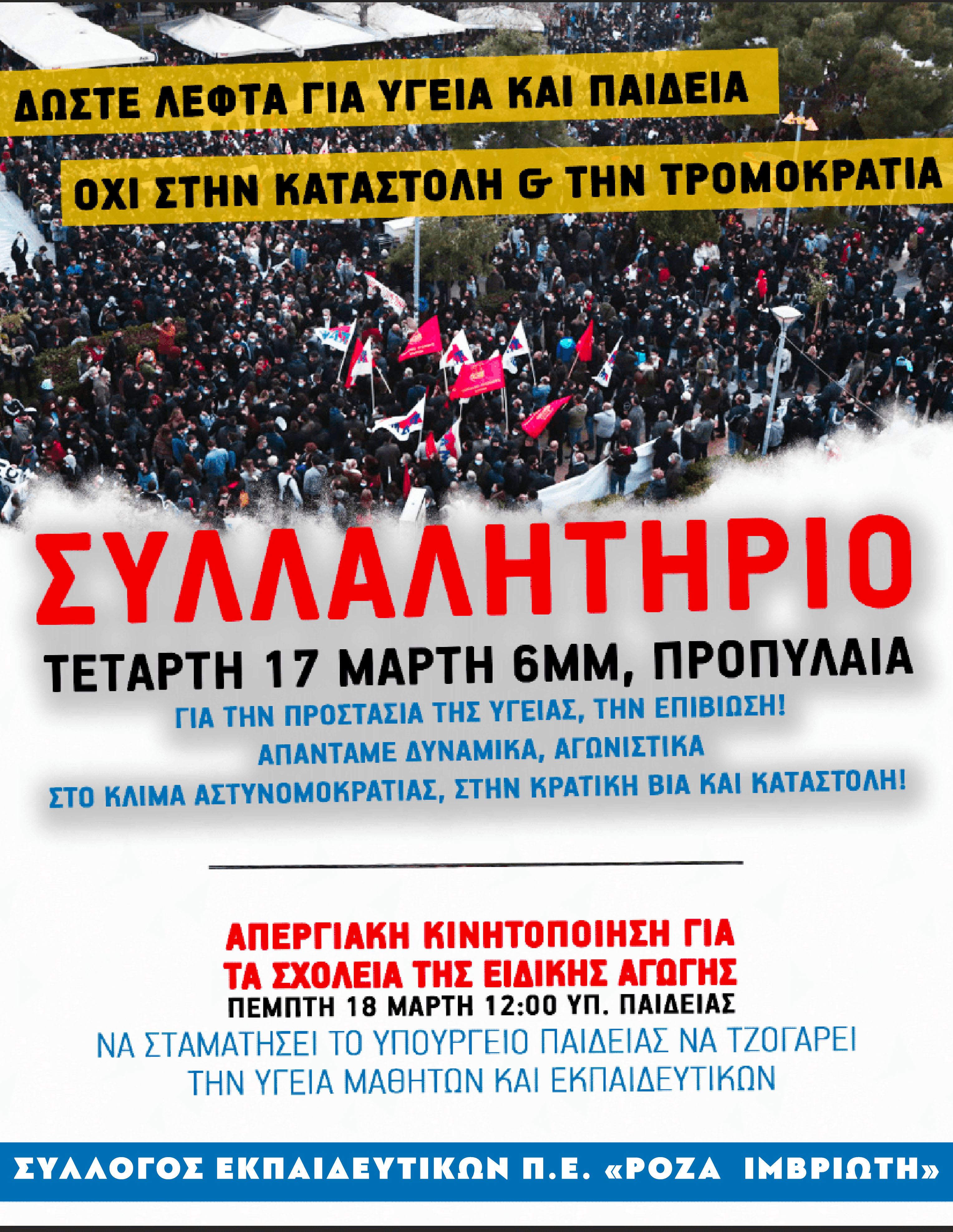 ΣΥΝΤΟΝΙΣΤΙΚΗ ΕΠΙΤΡΟΠΗ ΣΩΜΑΤΕΙΩΝ ΚΑΙ ΦΟΡΕΩΝ ΓΙΑ ΤΗΝ Π.Φ.Υ. ΣΤΗΝ ΚΑΙΣ/ΝΗ (Συμμετέχει o Σύλλογός μας "ΡΟΖΑ ΙΜΒΡΙΩΤΗ): ΚΑΛΕΣΜΑ ΣΕ ΚΙΝΗΤΟΠΟΙΗΣΗ ΣΤΟ ΛΑΪΚΟ Τετάρτη 24/3/2021 στις 6 μμ (Συνάντηση Ούλωφ Πάλμε και Παπάγου και πορεία στο ΛΑΪΚΟ)