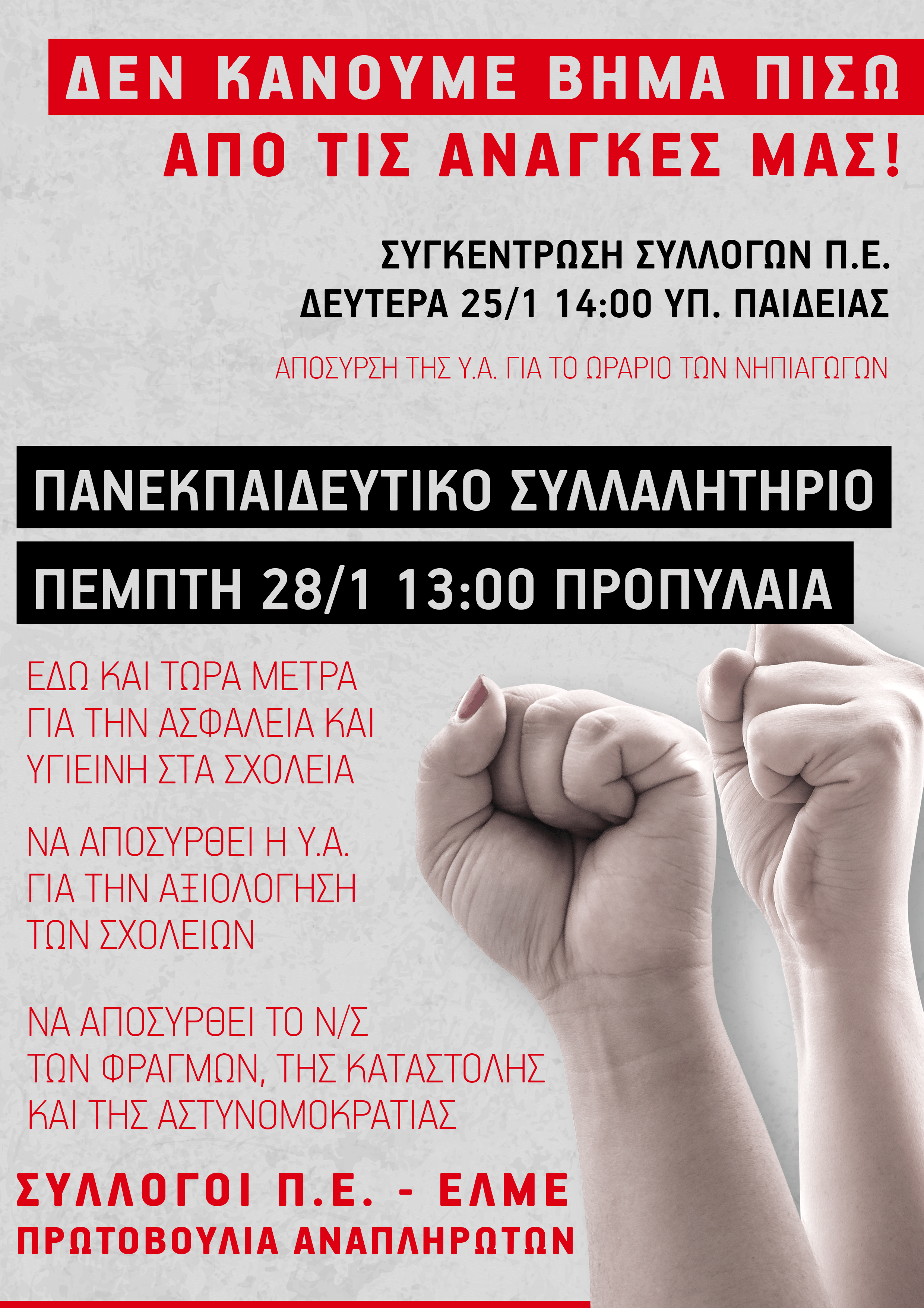 ΑΦΙΣΑ: ΔΕΝ ΚΑΝΟΥΜΕ ΒΗΜΑ ΠΙΣΩ ΑΠΟ ΤΙΣ ΑΝΑΓΚΕΣ ΜΑΣ! Συγκέντρωση 25/1/2021 στις 2 μμ Υπ. Παιδείας - Πάρτε πίσω την ΥΑ για αύξηση του ωραρίου των Νηπιαγωγών - και 28/1 στις 13.00 Προπύλαια Πανεκπαιδευτικό Συλλαλητήριο!