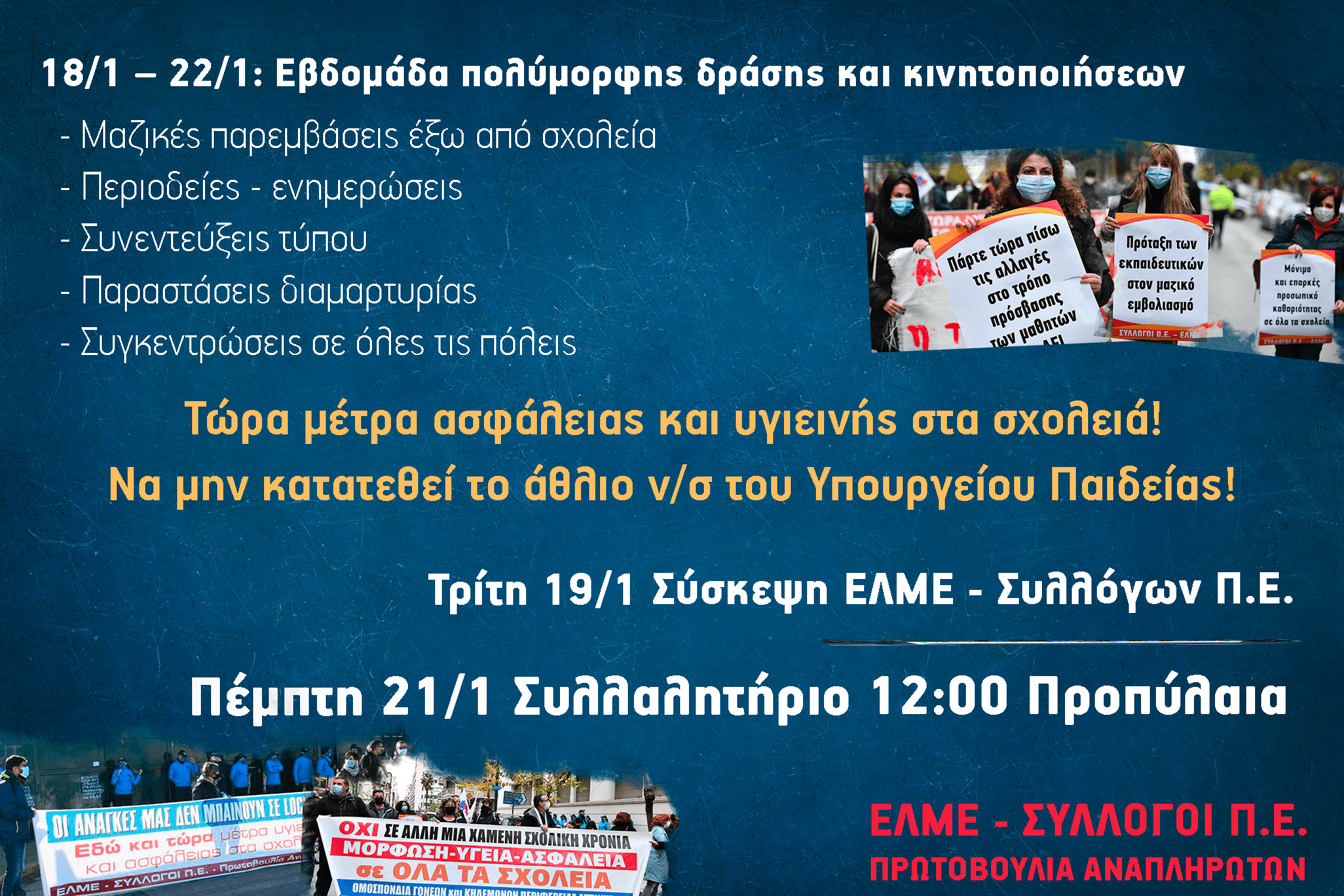 ΑΦΙΣΑ ΔΙΕΚΔΙΚΗΣΕΙΣ ΜΑΣ ΓΙΑ ΑΣΦΑΛΗ ΑΝΟΙΧΤΑ ΣΧΟΛΕΙΑ - ΠΑΡΤΕ ΜΕΤΡΑ ΤΩΡΑ! ΣΥΜΜΕΤΕΧΟΥΜΕ ΣΤΙΣ ΚΙΝΗΤΟΠΟΙΗΣΕΙΣ ΕΚΠΑΙΔΕΥΤΙΚΩΝ ΚΑΙ ΓΟΝΙΩΝ 14/1 στις 2 μμ ΥΠ. ΠΑΙΔΕΙΑΣ και 15/1/2021 στις 2 μμ ΥΠ. ΥΓΕΙΑΣ.