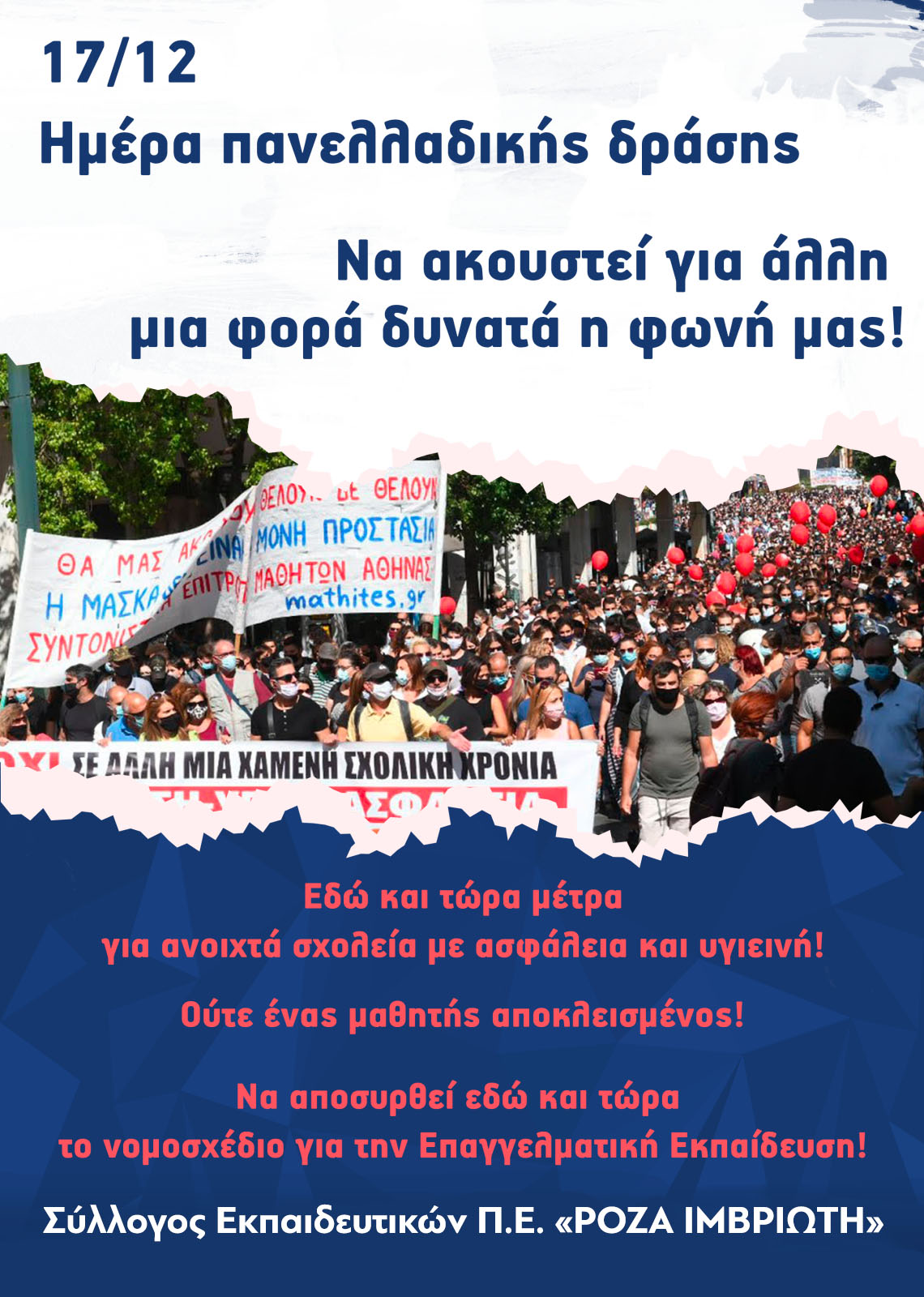 249ο Ενημ. Δελτίο Τύπου για Παράσταση ΣΥΛΛΟΓΩΝ-ΕΛΜΕ-ΠΡΩΤΟΒΟΥΛΙΑΣ στο Σύνταγμα, συμμετείχε ο Σύλλογός μας "ΡΟΖΑ ΙΜΒΡΙΩΤΗ", και άλλες δράσεις στην Πανελλαδική Μέρα Δράσης για την Εκπ/ση, Μέτρα τώρα για τη ζωή μας και το άνοιγμα των σχολείων! 17/12/2020