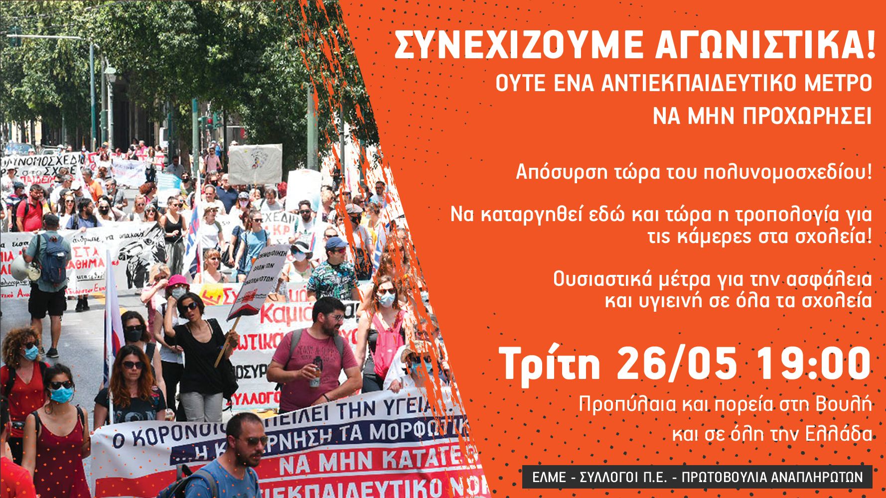 Αφίσα Κάλεσμα ΣΥΛΛΟΓΩΝ ΕΚΠΑΙΔΕΥΤΙΚΏΝ Π.Ε. - ΕΛΜΕ - ΠΡΩΤΟΒΟΥΛΙΑΣ ΑΝΑΠΛΗΡΩΤΩΝ: Συνεχίζουμε αγωνιστικά! Ούτε ένα μέτρο να μην περάσει! Συλλαλητήριο Τρίτη 26 Μαϊου 2020 7 μμ Προπύλαια, πορεία στη Βουλή με καλλιτεχνικά δρώμενα!