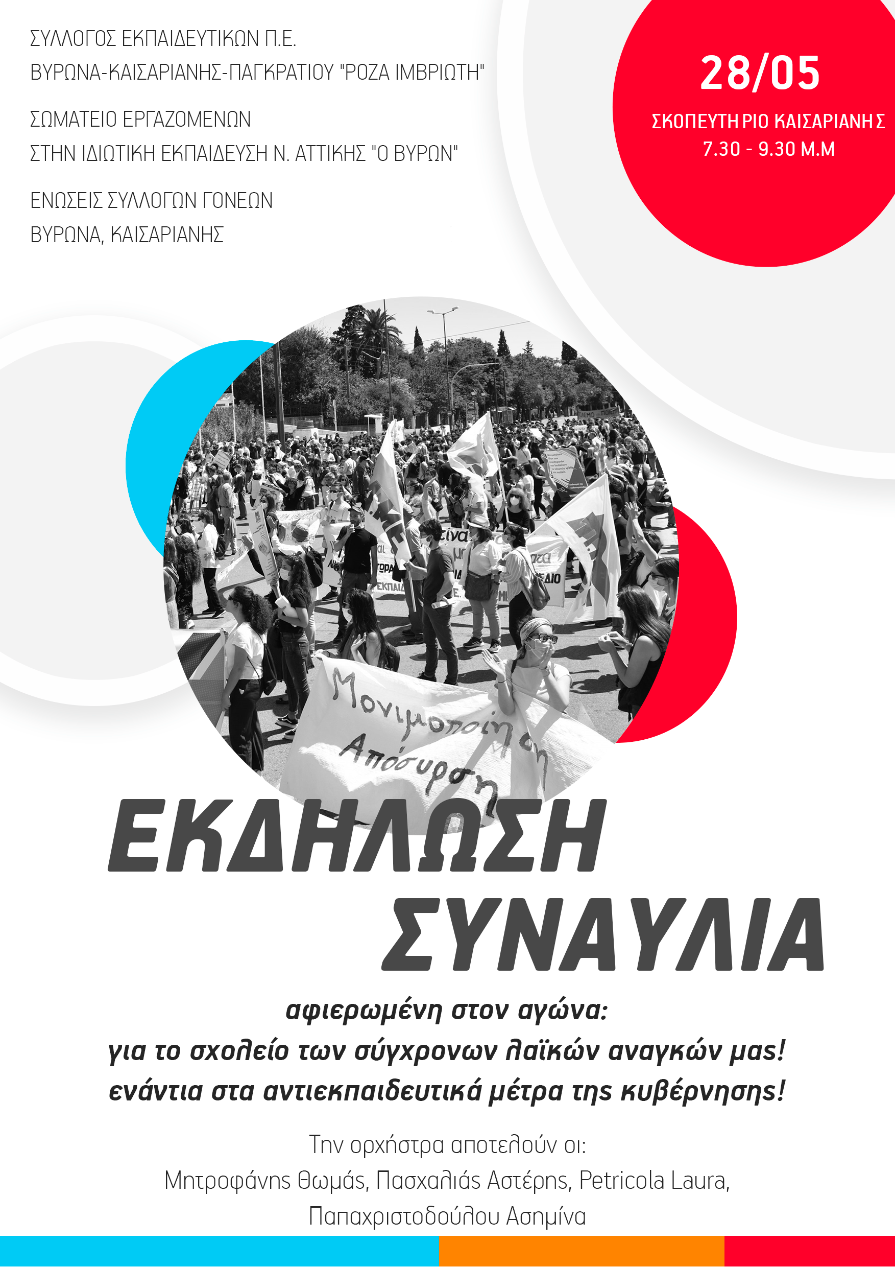 ΕΚΔΗΛΩΣΗ-ΣΥΝΑΥΛΙΑ αφιερωμένη ΣΤΟΝ ΑΓΩΝΑ ΓΙΑ ΤΟ ΣΧΟΛΕΙΟ ΤΩΝ ΣΥΓΧΡΟΝΩΝ ΛΑΪΚΩΝ ΑΝΑΓΚΩΝ ΜΑΣ ΚΑΙ ΕΝΑΝΤΙΑ ΣΤΑ ΑΝΤΙΕΚΠΑΙΔΕΥΤΙΚΑ ΜΕΤΡΑ ΤΗΣ ΚΥΒΕΡΝΗΣΗΣ! Πέμπτη 28/5/2020 7.30-9.30 μ.μ. ΣΚΟΠΕΥΤΗΡΙΟ Καισαριανής! Σας περιμένουμε!