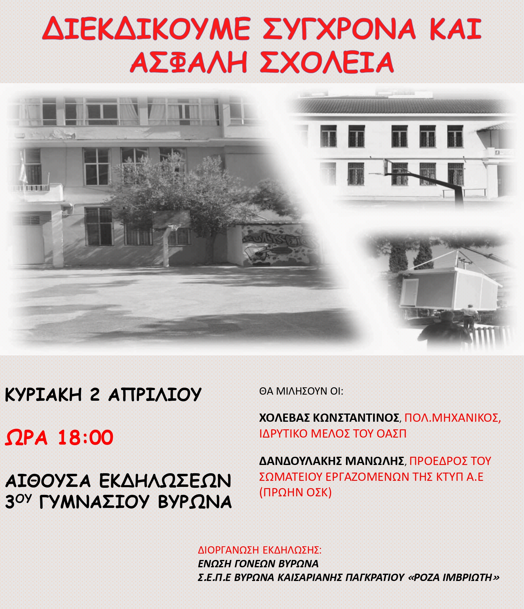 ΕΚΔΗΛΩΣΗ Ένωσης Γονέων Βύρωνα - Συλλόγου Εκπαιδευτικών Π.Ε. "ΡΟΖΑ ΙΜΒΡΙΩΤΗ": ΔΙΕΚΔΙΚΟΥΜΕ ΣΥΓΧΡΟΝΑ ΚΑΙ ΑΣΦΑΛΗ ΣΧΟΛΕΙΑ Κυριακή 2 Απριλίου 2023 στις 18.00 στην αίθουσα εκδηλώσεων 3ου Γυμνασίου Βύρωνα (Νταμάρια)