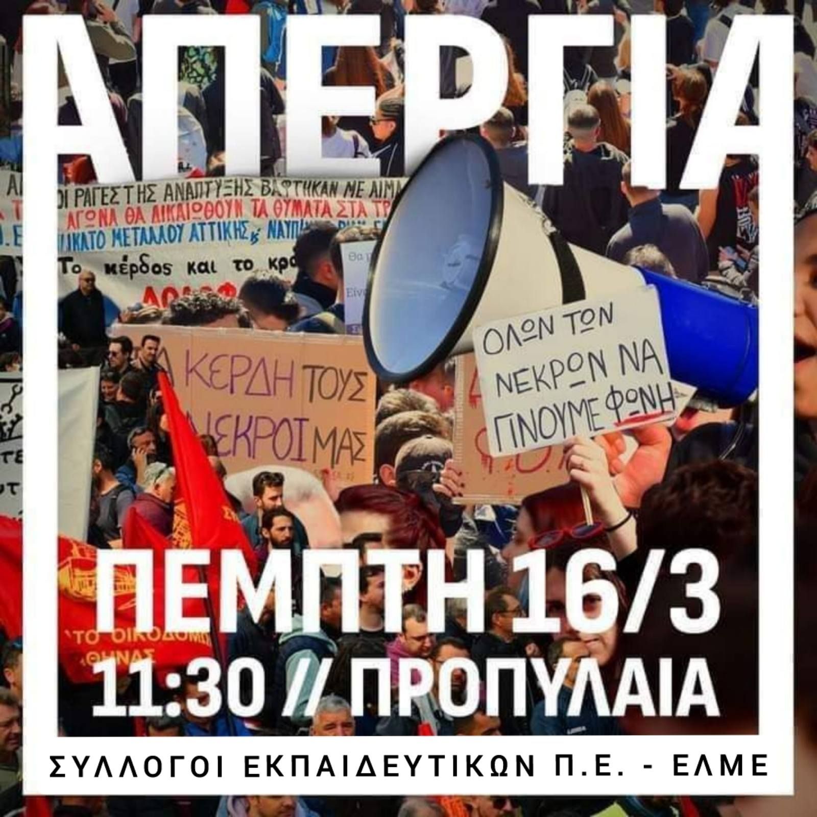 Αφίσα 2 Κάλεσμα ΣΥΛΛΟΓΩΝ ΕΚΠΑΙΔΕΥΤΙΚΩΝ Π.Ε. - ΕΛΜΕ στην Πανεργατική Απεργία 16/3/2023 και στο Συλλαλητήριο 11.30 ΠΡΟΠΥΛΑΙΑ με Προσυγκέντρωση Εκπ/κών 10.45 Βουκουρεστίου και Πανεπιστημίου.