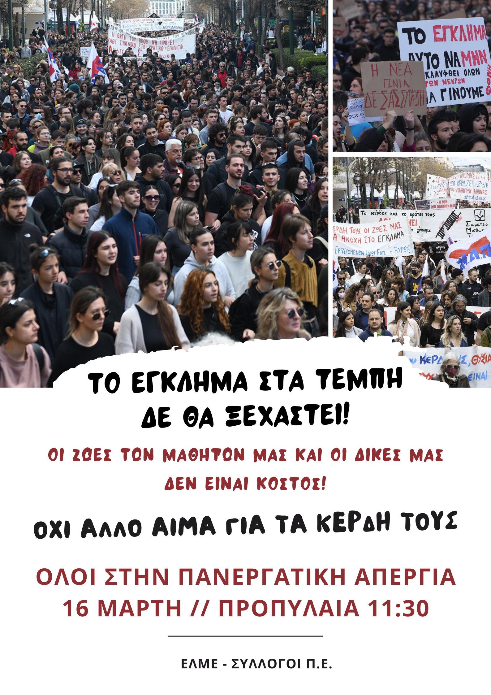 216ο Ενημ. ΤΕΤΑΡΤΗ 8 ΤΟΥ ΜΑΡΤΗ ΑΠΕΡΓΟΥΜΕ! ΣΥΓΚΕΝΤΡΩΣΗ 12.30 μμ ΠΡΟΠΥΛΑΙΑ! ΔΕΝ ΕΙΝΑΙ Η ΚΑΤΑΡΑ ΤΩΝ ΤΕΜΠΩΝ ΕΙΝΑΙ ΟΙ ΝΟΜΟΙ ΤΩΝ ΚΕΡΔΩΝ! ΤΟ ΕΓΚΛΗΜΑ ΣΤΑ ΤΡΕΝΑ ΝΑ ΜΗ ΣΥΓΚΑΛΥΦΘΕΙ! Πέμπτη 9/3 ΣΥΝΕΛΕΥΣΗ Συλλόγου μας 6μμ, 6/3 2μμ ΙΕΠ, 7/3 7μμ Αγ. Λάζαρο Βύρωνα 5/3/23