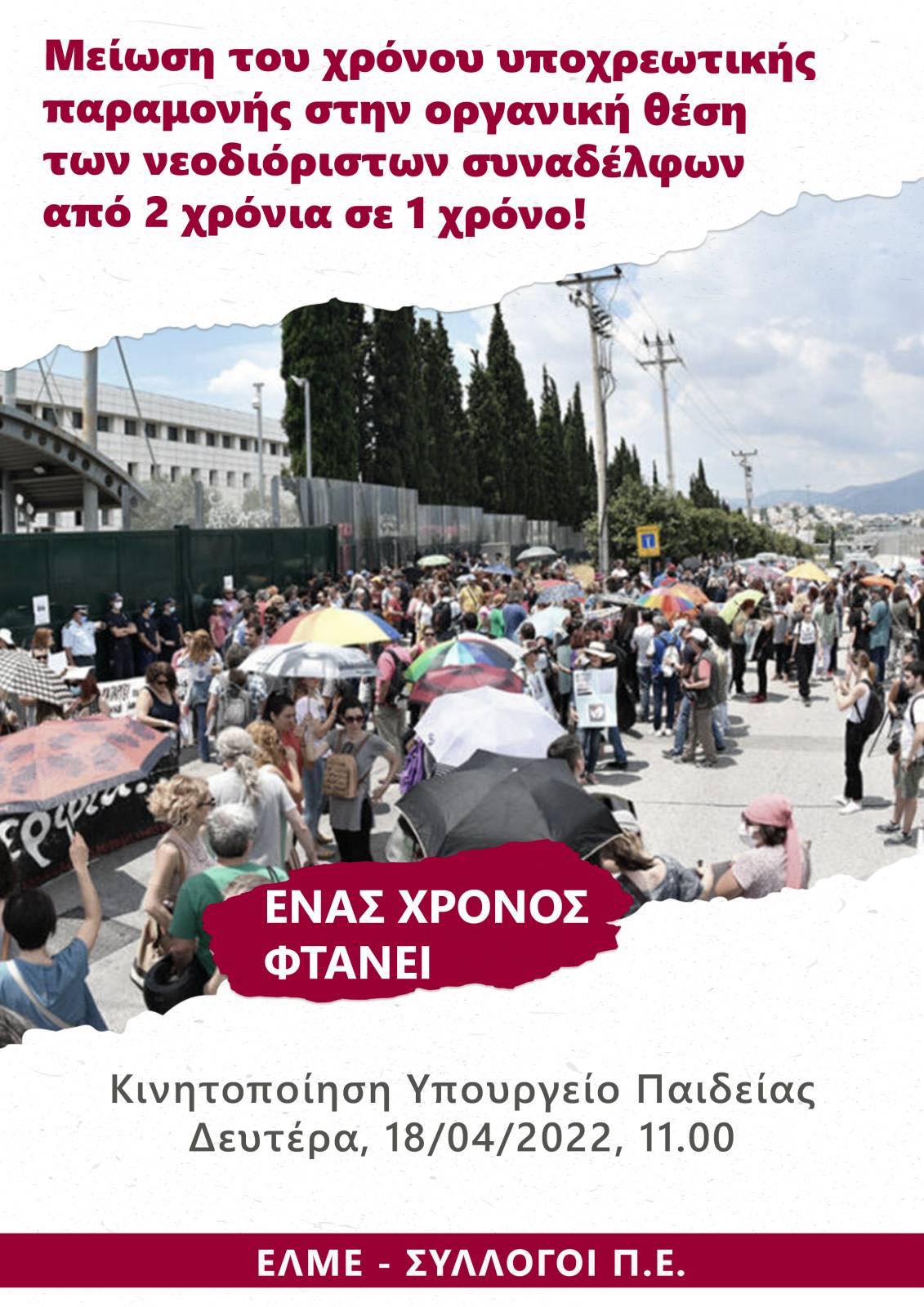 61ο Ενημ. Στηρίζουμε το αίτημα των νεοδιορίστων εκπαιδευτικών για μείωση του χρόνου παραμονής στον τόπο διορισμού από 2 σε 1 χρόνο - - καλούμε στην Κιν/ση 18/4 11πμ Υπ. Παιδείας 7/4/2022