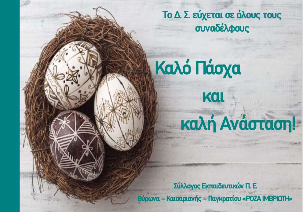 Ευχές του Δ.Σ. του Συλλόγου μας "ΡΟΖΑ ΙΜΒΡΙΩΤΗ" προς όλους τους συναδέλφους για το Πάσχα 2022. ΚΑΛΗ ΑΝΑΣΤΑΣΗ!