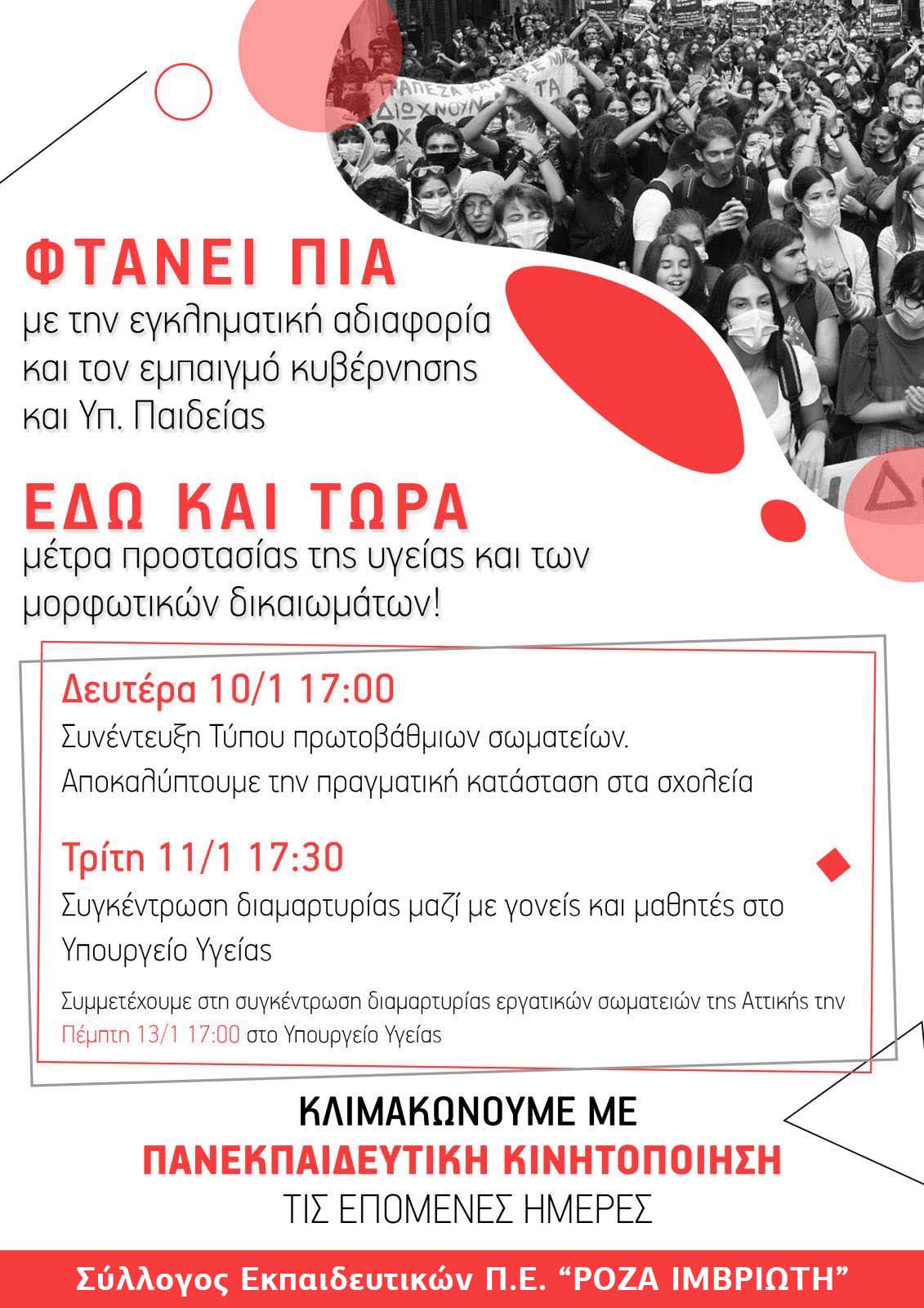 13ο Ενημ. Μέτρα τώρα για σχολεία ασφαλή κι όχι εστίες υπερμετάδοσης κορονοϊού! Κινητοποιήσεις: Δευτέρα 10/1 στις 5μμ Συνέντευξη, Τρίτη 11/1 στις 17.30 Συγκέντρωση Εκπ/κών, Γονιών, Μαθητών Υπ. Υγείας, Πέμπτη 13/1 Συγκέντρωση Συνδικάτων Υπ. Υγείας! 6/1/2022