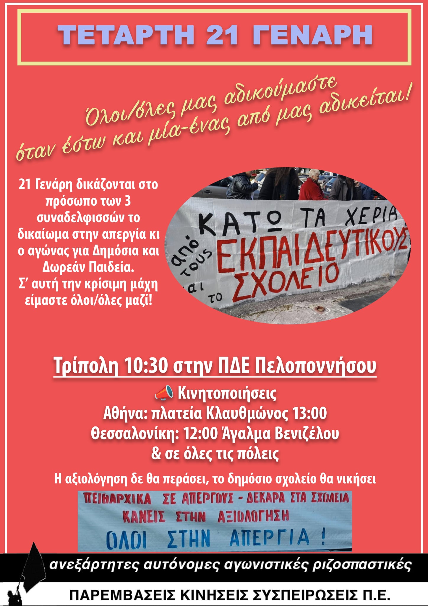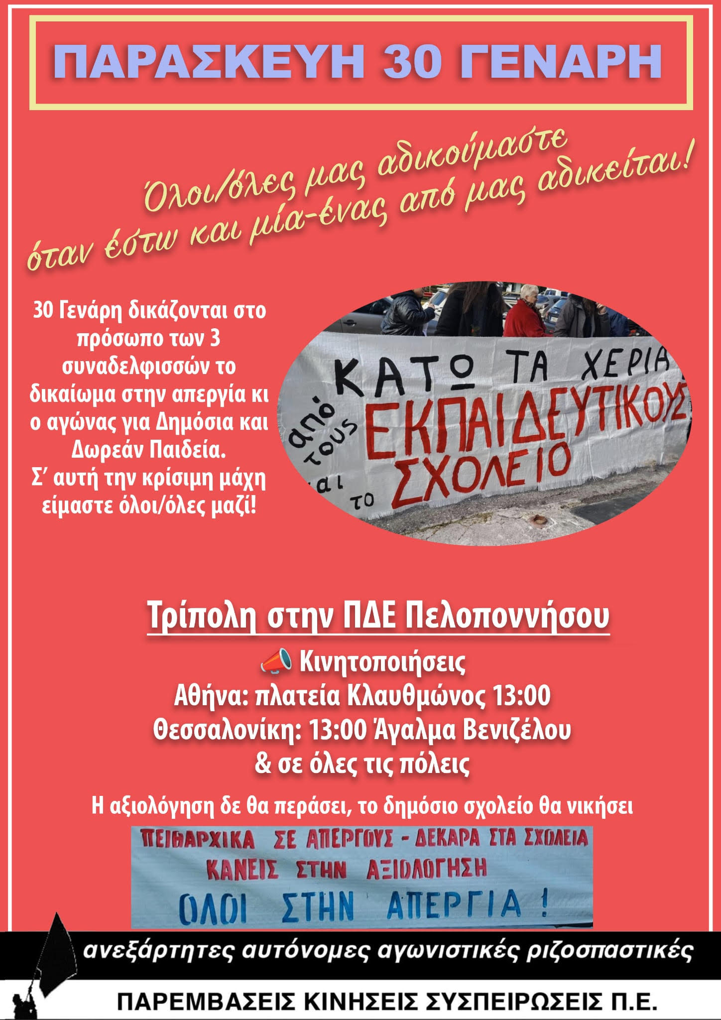 29ο Ενημ. Την Παρασκευή 30 Γενάρη στις 13.00 ξανά δίπλα στις τρεις πρώτες συναδέλφισσες που περνάνε από Πειθαρχικό Συμβούλιο στην Π.Δ.Ε. Πελοποννήσου στην Τρίπολη! ΜΟΝΟ ΔΙΚΑΙΩΣΗ! 28.1.2026